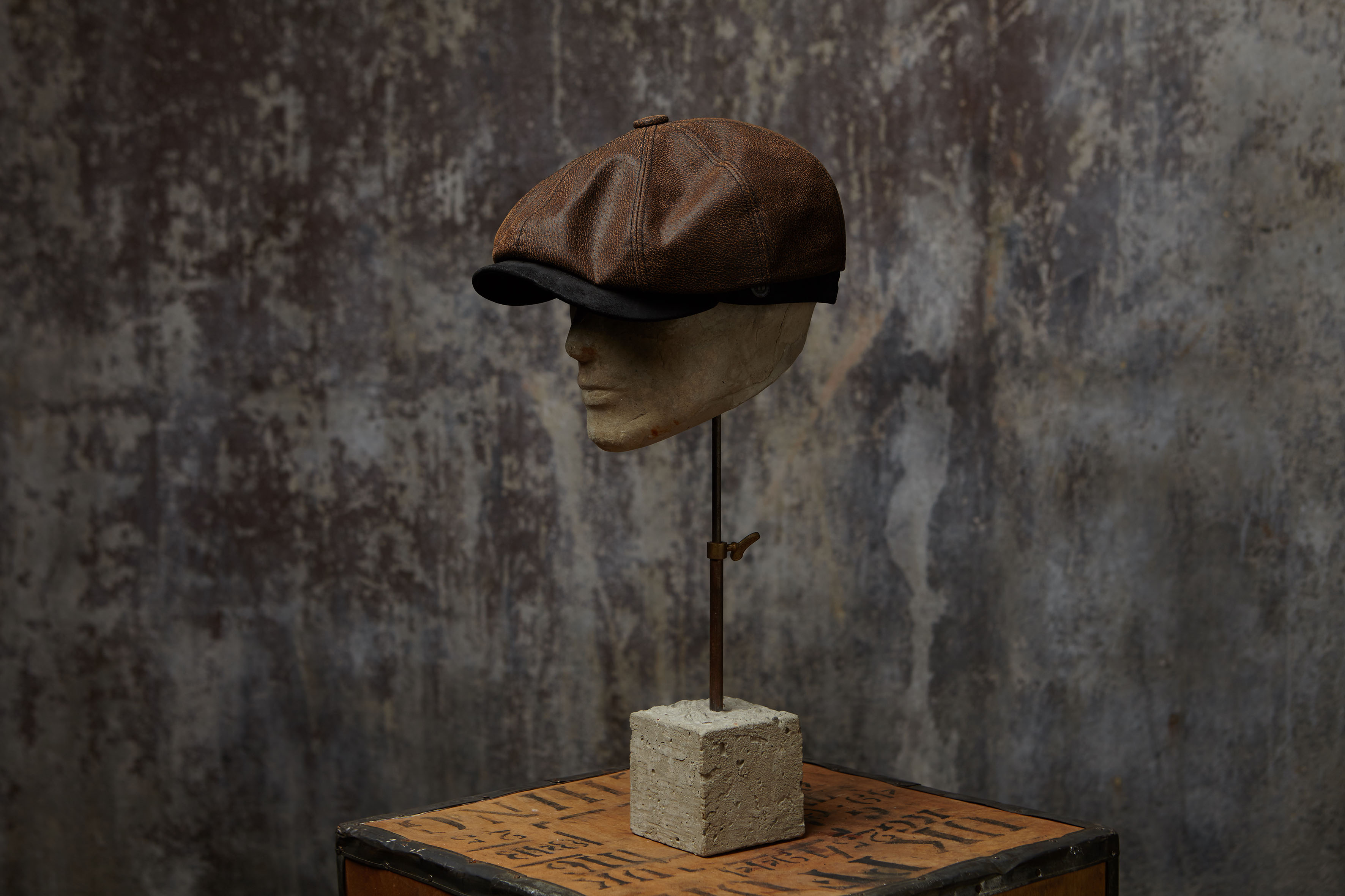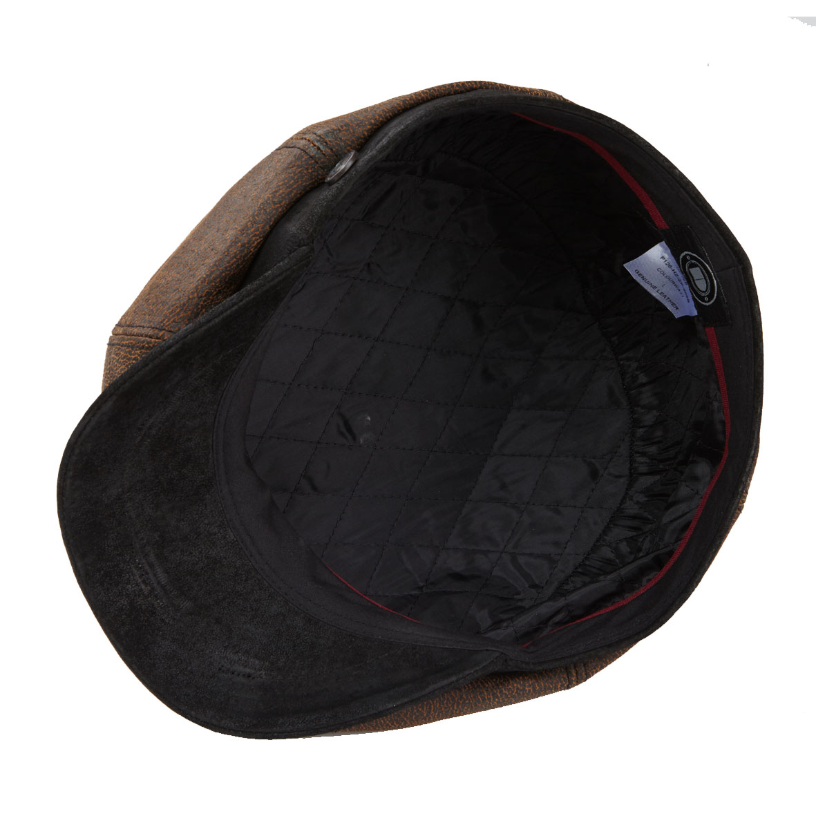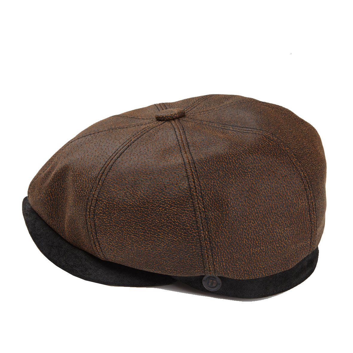 - Black leather peak, button and back fillet